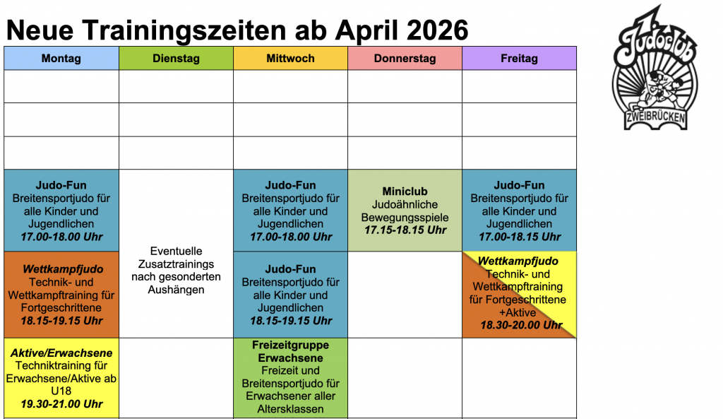 Das Training findet Montag, Mittwoch und Freitag von 17.00-18.00 Uhr statt, sowie Mittwoch von 18.15-19.15 Uhr.